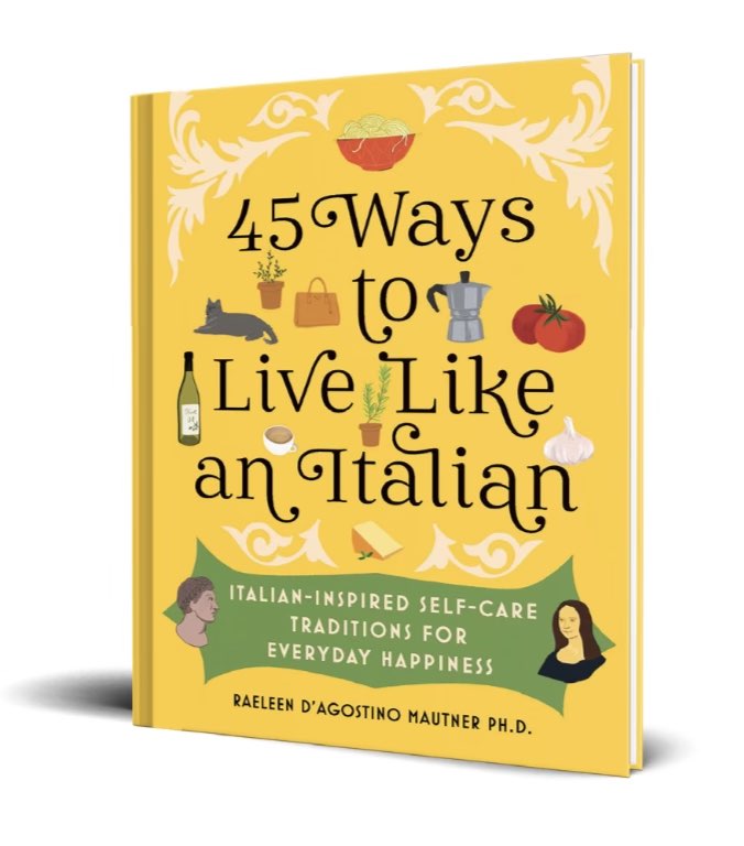I am now thrilled to let you know that my latest book: 45 WAYS TO LIVE LIKE AN ITALIAN: Italian-Inspired Self-Care Traditions for Everyday Happiness (Sourcebooks Inc.) is now available on Amazon and Barnes and Noble and anywhere books are sold. If you love reading it as much as I loved writing and researching it–please leave a review on Amazon and BN.com.